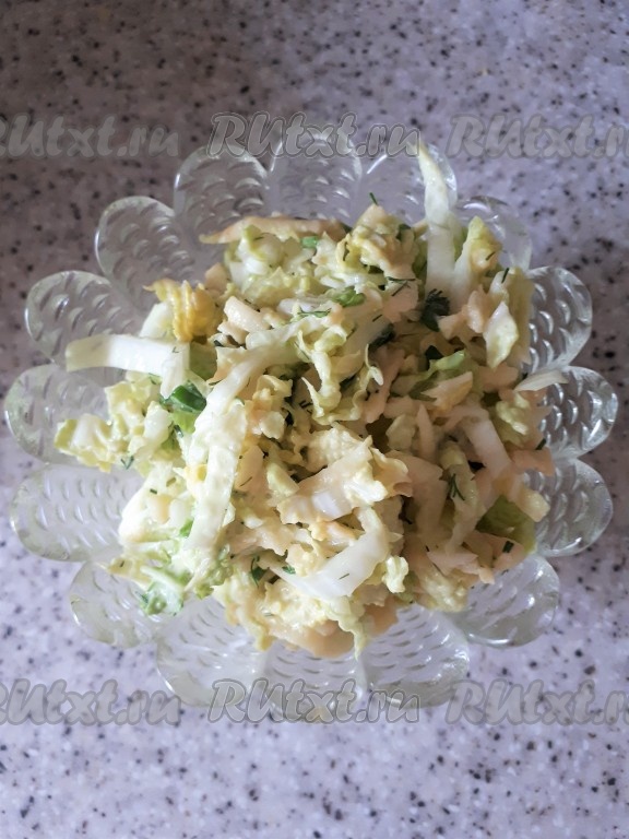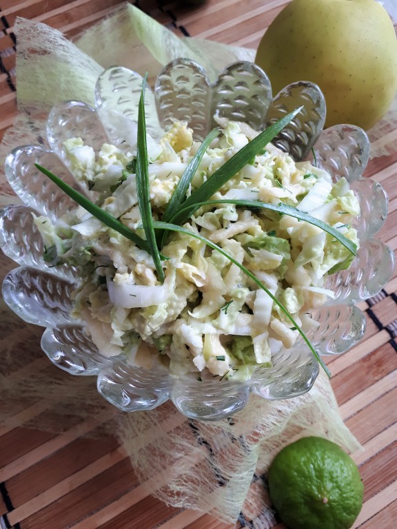 Вкусный, сочный салат из пекинской капусты с яблоком готов. Остаётся выложить салат в салатницу и украсить по своему усмотрению.