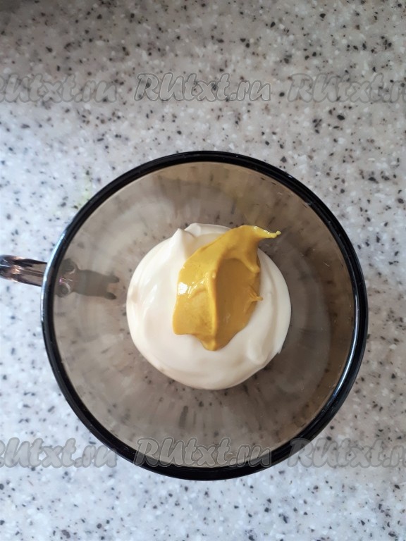 Приготовить заправку для салата, для этого соединить сметану и готовую горчицу. Горчицу советую взять вкусную - такую, какую вы любите.