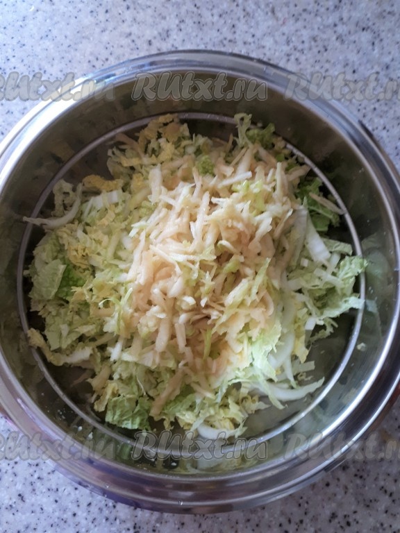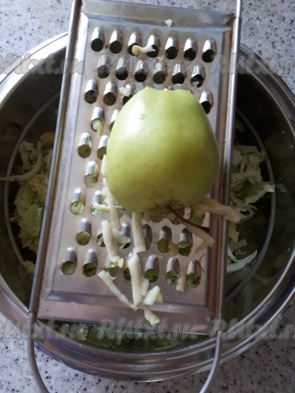 Яблоко (кожицу, по желанию, можно очистить) натереть на тёрке, добавить к пекинской капусте.