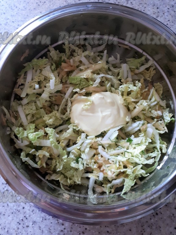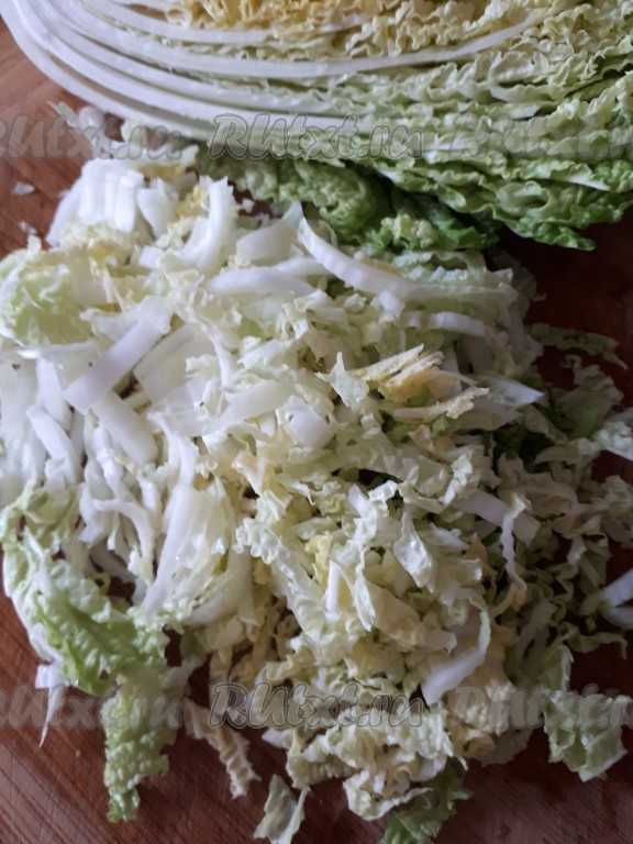 Пекинскую капусту вымыть, нашинковать, сложить в миску.