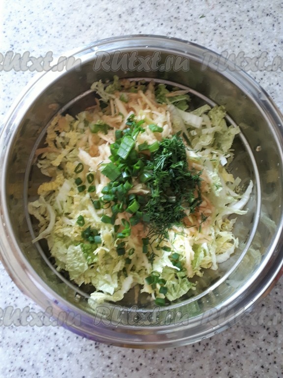 Зелёный лук и укроп измельчить, добавить в салат из пекинской капусты и яблока, перемешать.