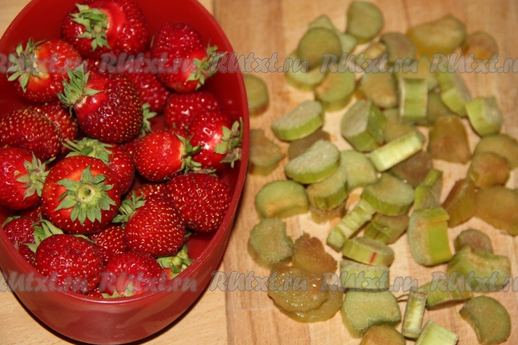 Стебли ревеня промыть и очистить от тонкой плёнки по всей длине стебля. Клубнику очистить от зелёных хвостиков и промыть. Стебли ревеня нарезать на кусочки толщиной 1-1,5 см.