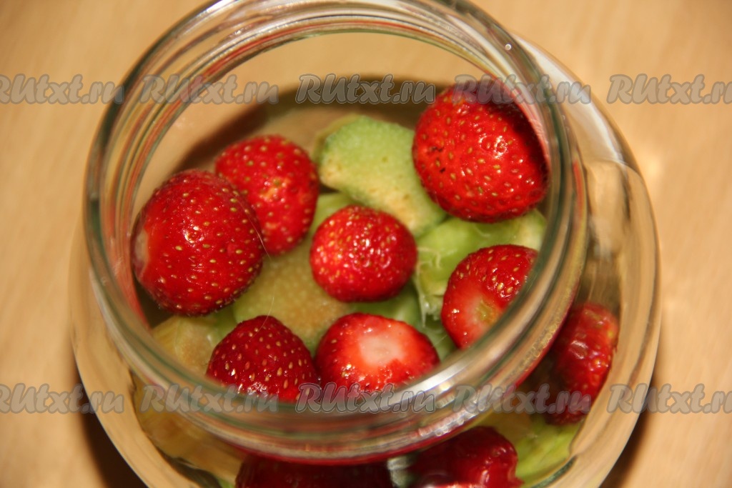 Вначале нарезанный ревень равномерно разложить по стерильным банкам. Затем разложить равномерно клубнику по баночкам. Банки должны быть заполнены на половину объёма.