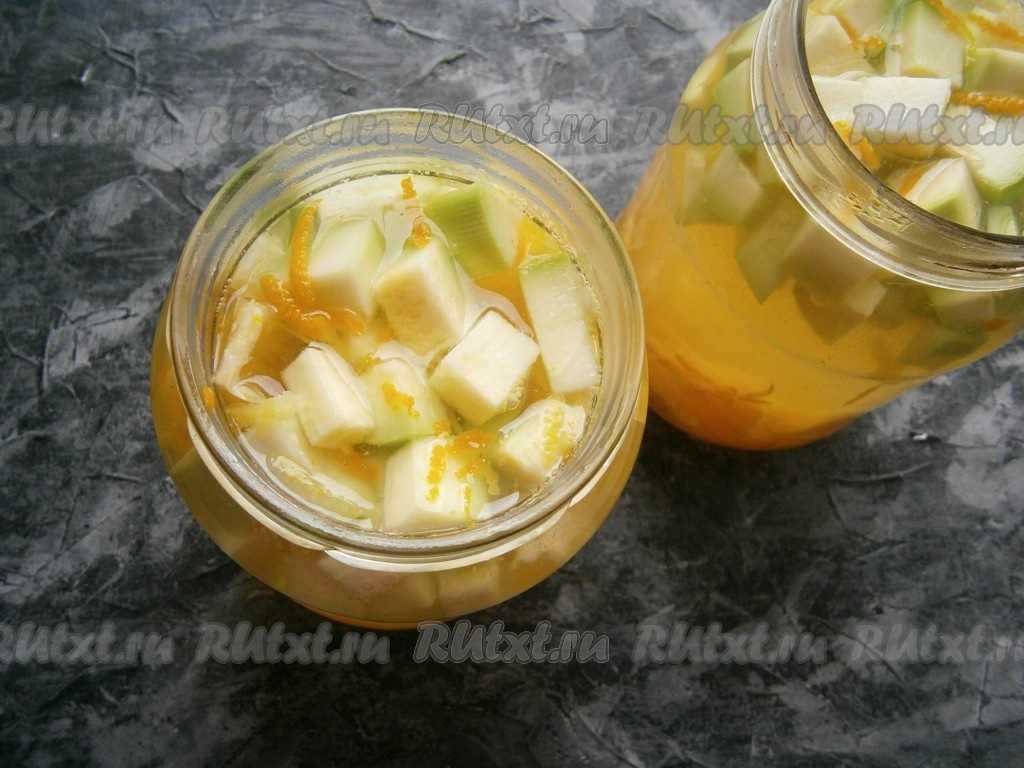 По чистым простерилизованным банкам равномерно разложить кусочки кабачков и апельсинов, а также цедру лимонов и апельсинов.