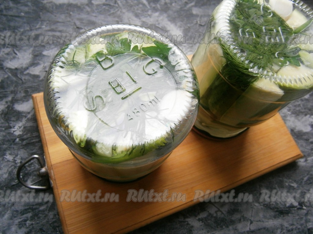 Залить банки с огурцами и кабачками кипятком, прикрыть крышками и оставить на 10 минут. Затем воду из банок перелить в кастрюлю, снова её вскипятить и залить кабачки с огурцами кипятком ещё на 5 минут.