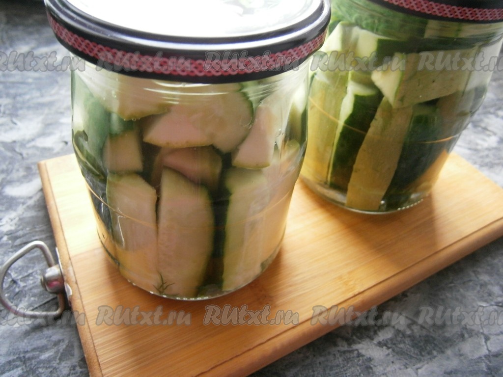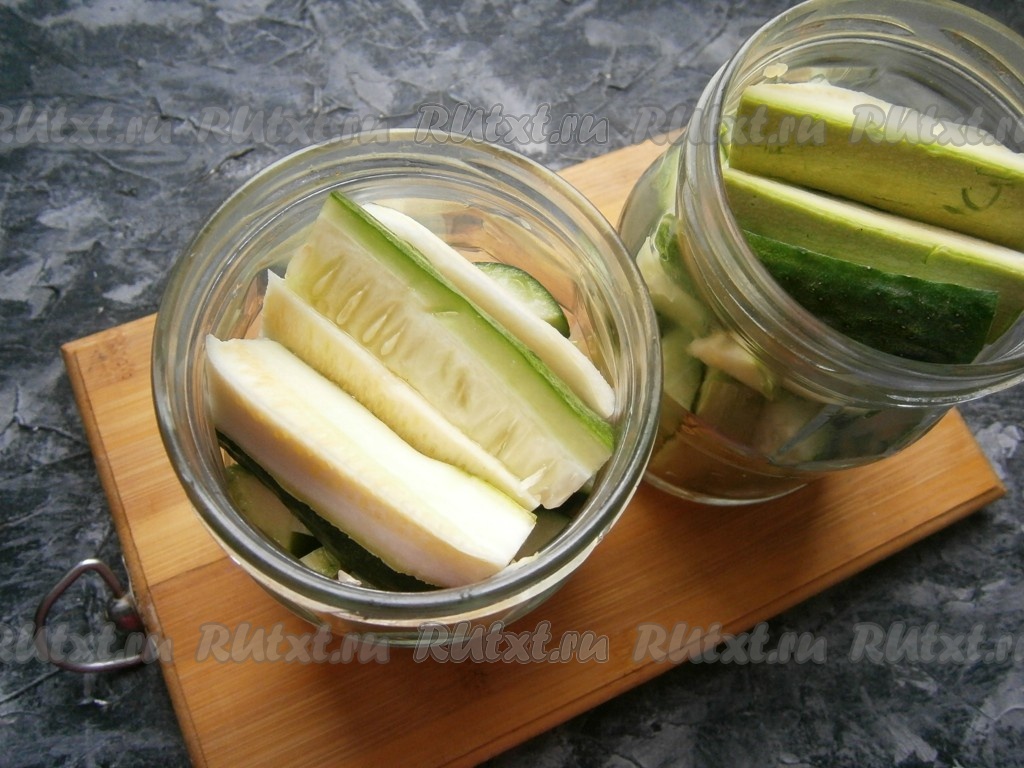 Огурчики и кабачки (молоденькие кабачки можно готовить вместе с кожурой) нарезать, приблизительно, одинаковыми брусочками, которые поместятся в пол-литровые баночки.