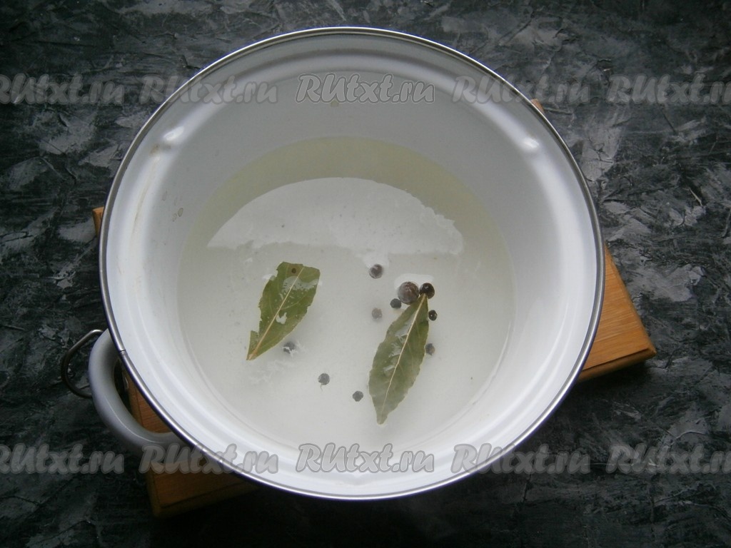 Снова воду слить в кастрюлю. Всыпать в кастрюлю с водой соль и сахар, добавить лавровые листочки, горошины чёрного и душистого перцев, довести до кипения, а затем проварить около 5 минут на среднем огне, после чего влить уксус.