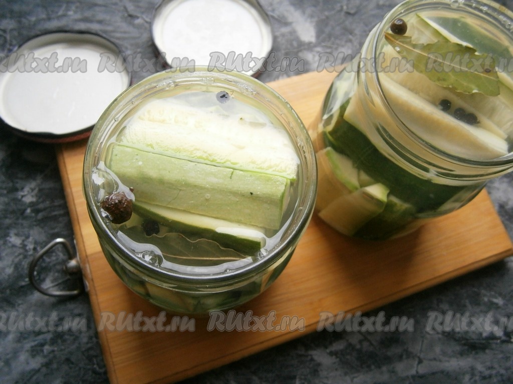 Огонь выключить, а горячий маринад влить в банки с кабачками и огурцами, заполняя баночки до горлышка.