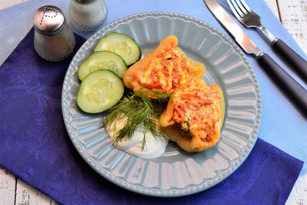 Подавать замечательный, очень вкусный перец, фаршированный кабачками, в горячем виде со сметаной или любимым соусом. Это блюдо готовится без добавления мяса и риса, а получается достаточно сытным.