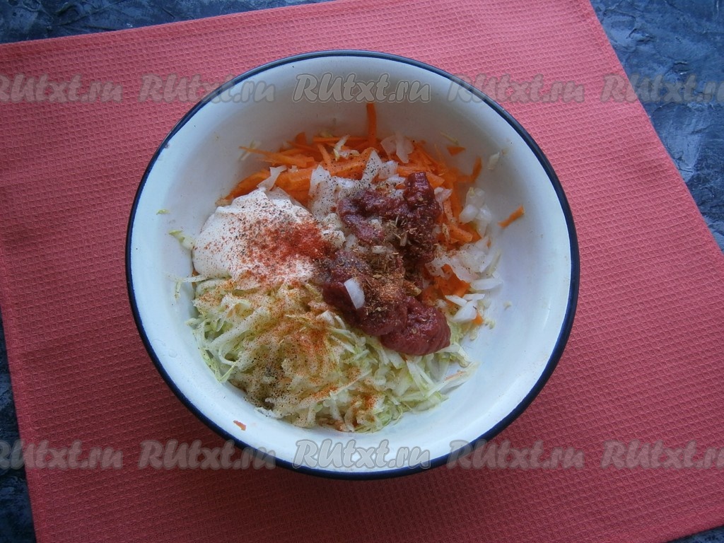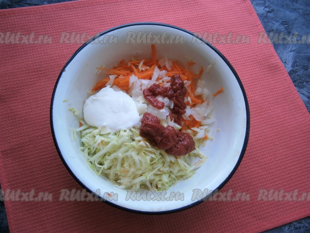 Добавить к натёртым овощам мелко нарезанный очищенный лук, 2 столовые ложки сметаны и 3 чайные ложки томатной пасты.
