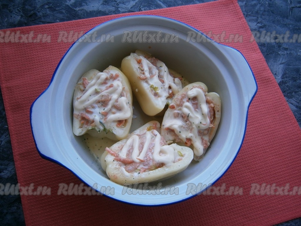 Нафаршировать получившейся начинкой половинки перцев. Сверху смазать фаршированные перцы майонезом (сделать сеточку или полосочки).