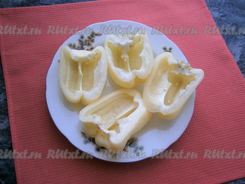 Вымытый болгарский перец разрезать вдоль на 2 части, удалить семенную коробку и семена.
