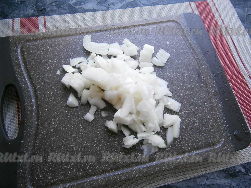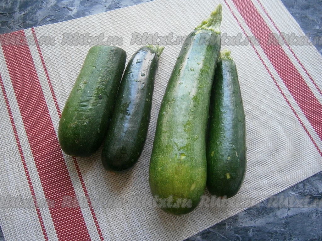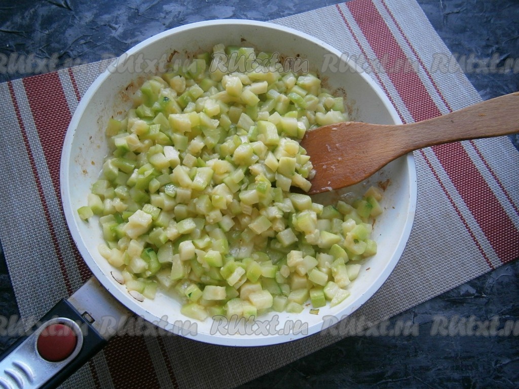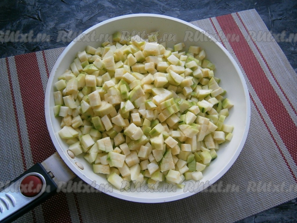 Кабачки нарезать небольшими кубиками, выложить в сковороду, в которую влить 80 грамм растительного масла.