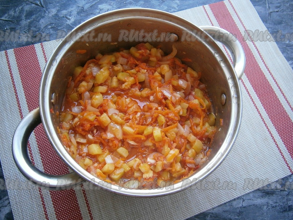 Перемешать, поставить кастрюлю на средний огонь, довести до кипения. Далее тушить кабачковую икру с помидорами на слабом огне под прикрытой крышкой, иногда помешивая, около 25 минут.