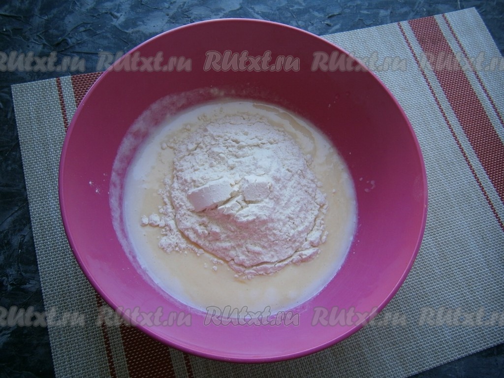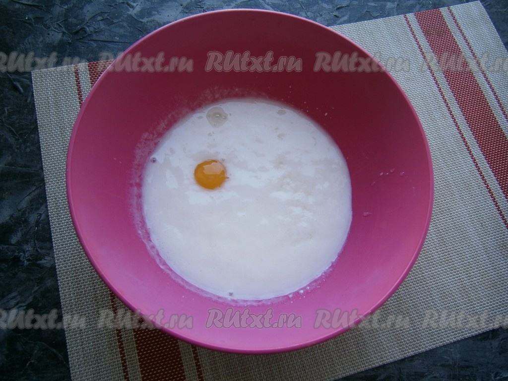 В кефир комнатной температуры всыпать соду, перемешать и оставить на 5-6 минут (сода за это время погасится в кефире). Затем добавить сырое яйцо, соль и сахар.