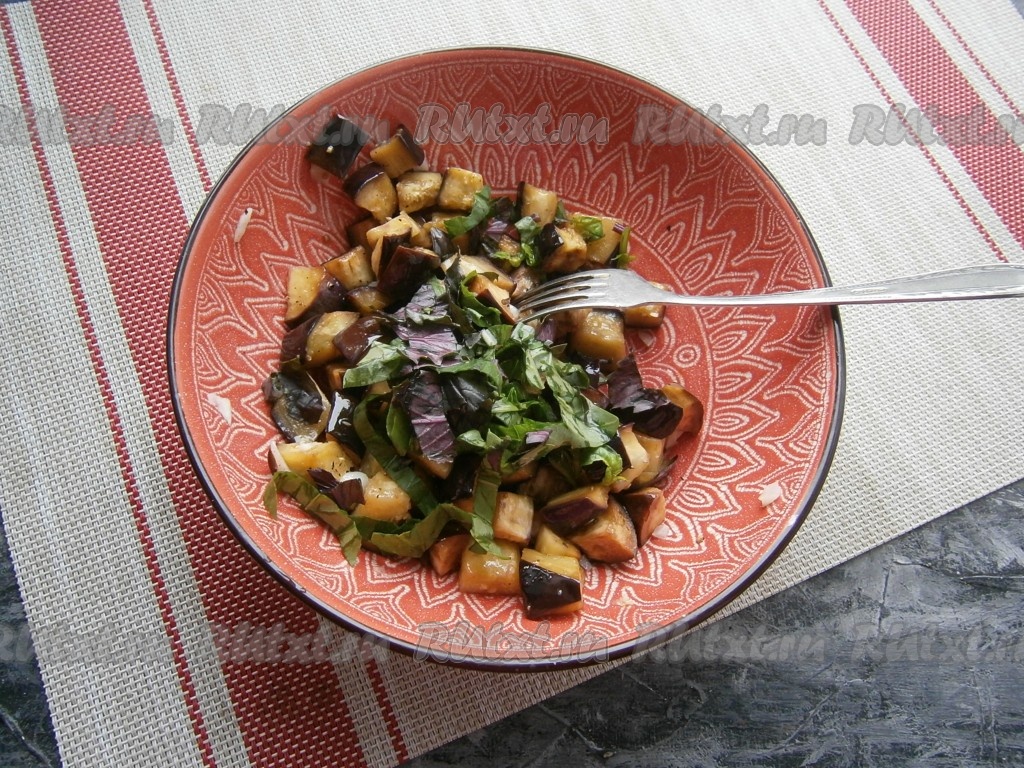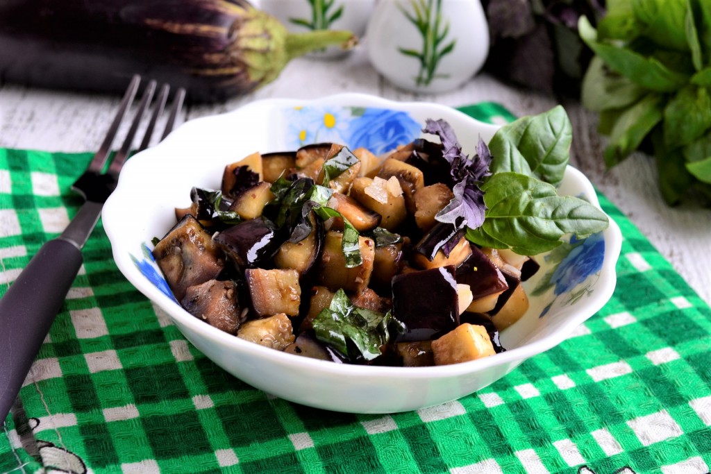 Запечённые в духовке (или микроволновке) баклажаны, приготовленные с базиликом и чесноком, вкусны как в тёплом, так и в охлаждённом виде, их можно подать и как отдельную закуску, и как гарнир.