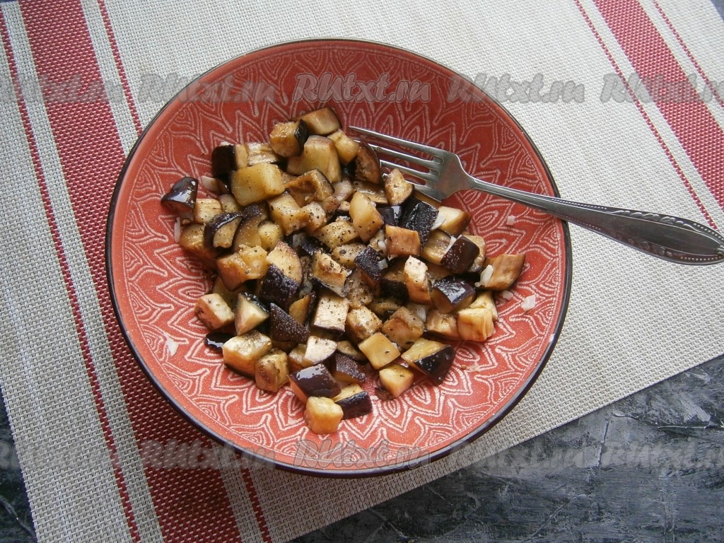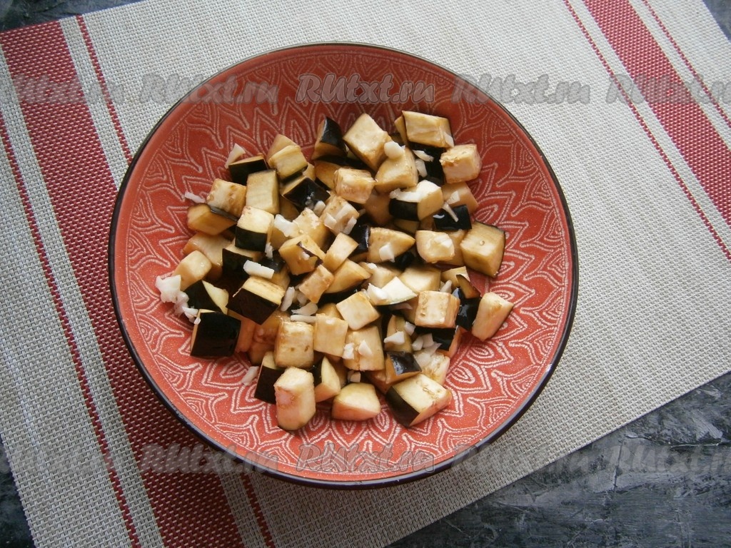 По прошествии 15 минут баклажаны отжать от выделившейся жидкости и разместить их в небольшой форме (или миске), перемешать с мелко нарезанным чесноком и оливковым маслом.