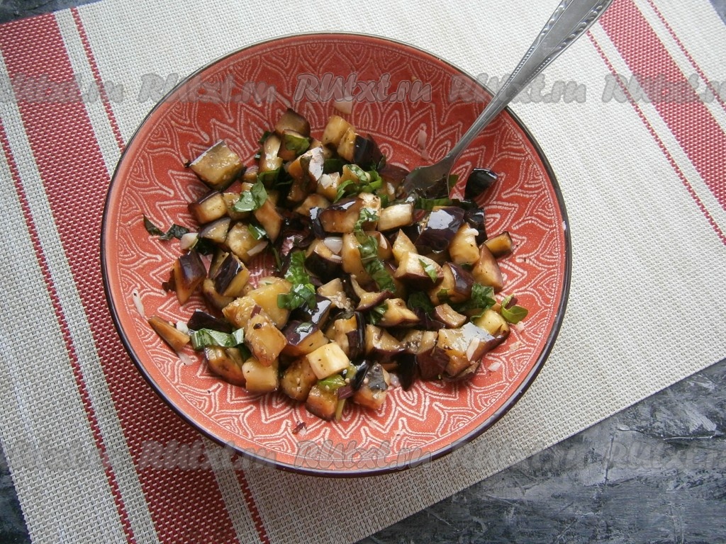 Запечь баклажаны в разогретой духовке при температуре 220-250 градусов около 15 минут (или отправить в микроволновку при мощности 750 Ватт на 5 минут). Затем запечённые баклажаны поперчить, посолить по вкусу, влить уксус.