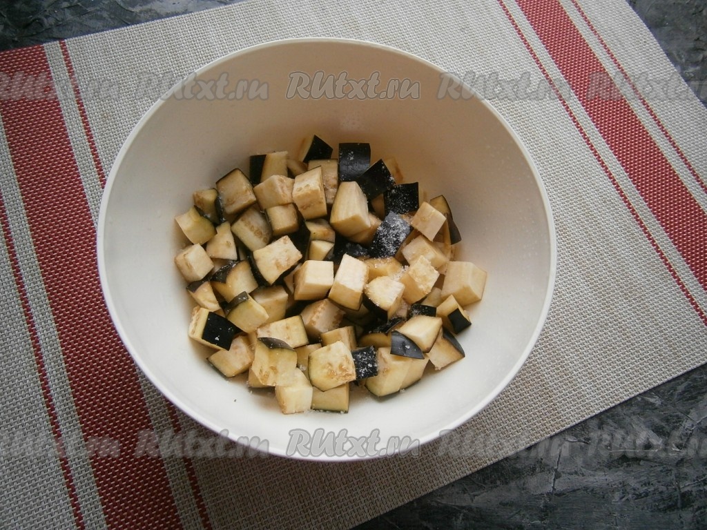 Баклажан нарезать крупными кубиками, посыпать солью и оставить на 15 минут.