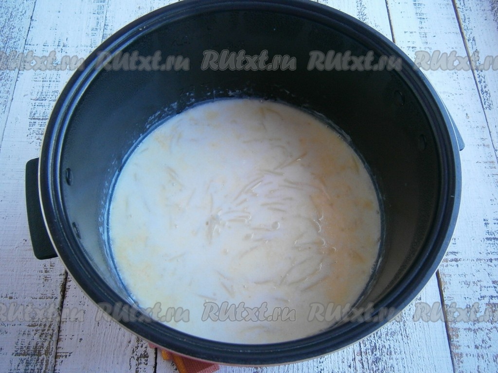 Всыпать вермишель в молоко, перемешать. Закрыть мультиварку крышкой и выставить режим "Молочная каша" на 15 минут. На этом режиме также нет кипения. После окончания программы оставить суп под крышкой ещё на 10 минут.