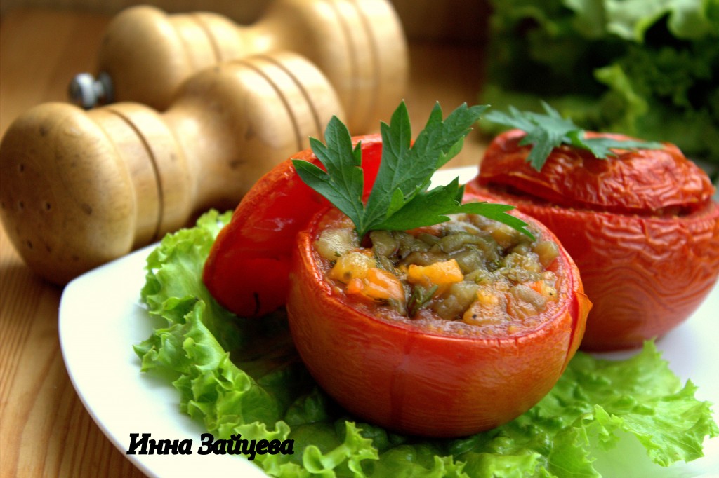 Достаём из духовки и подаём яркие, сочные помидоры, фаршированные баклажанами и болгарским перцем, к столу в горячем виде. Вот так достаточно просто без добавления мяса можно приготовить сытную, вкусную закуску. Уверена, это постное овощное блюдо понравится многим!