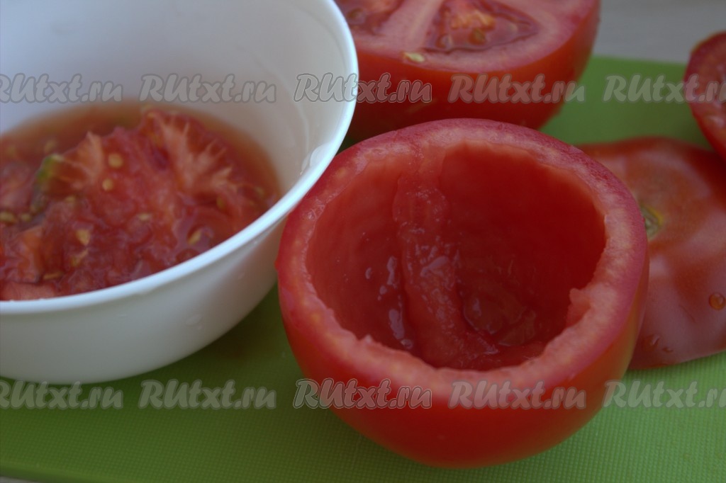 При помощи чайной ложечки аккуратно, не повреждая целостность помидора, удалить всю мякоть (мякоть помидора можно не выбрасывать, а приготовить томатный соус для пиццы).