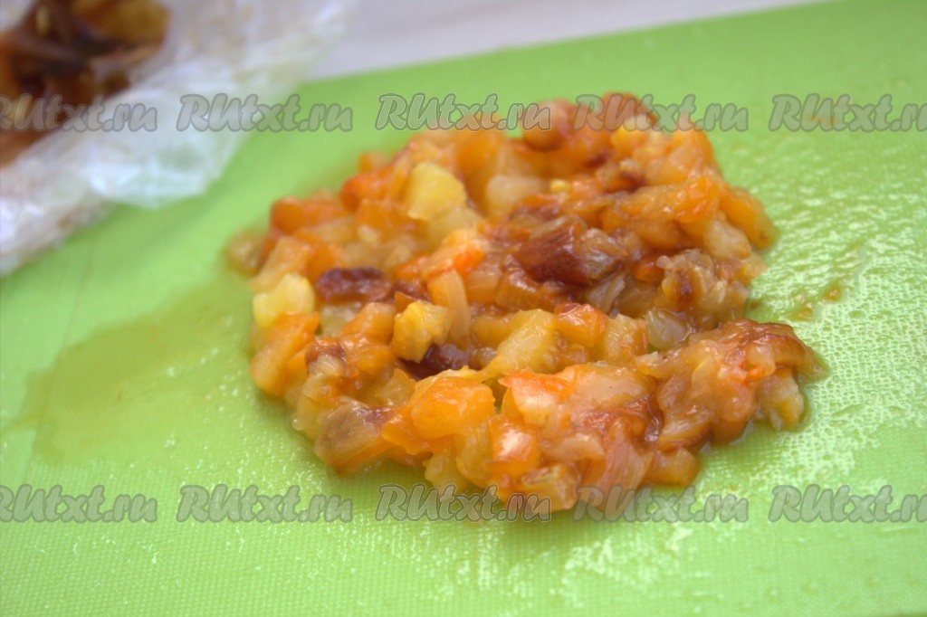 Затем снять кожицу с болгарского перца, удалить семена. Мякоть перца нарезать на мелкие кубики.