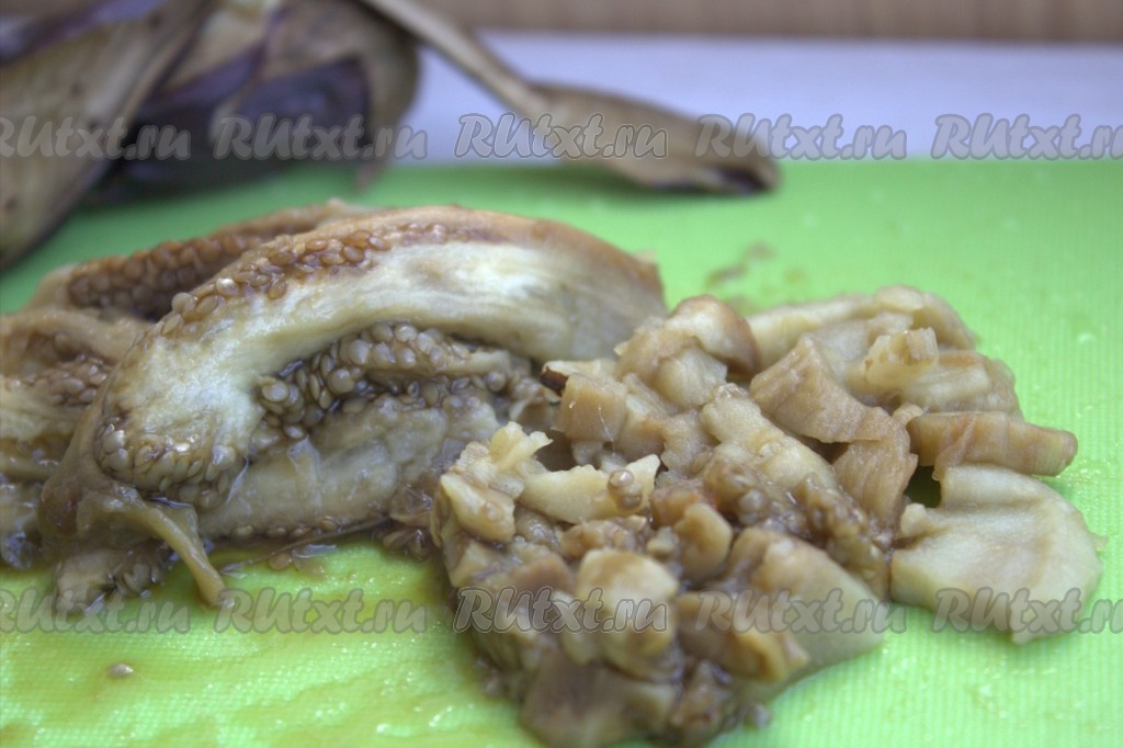 Готовый и остывший баклажан очистить от кожицы и также мелко нарезать.