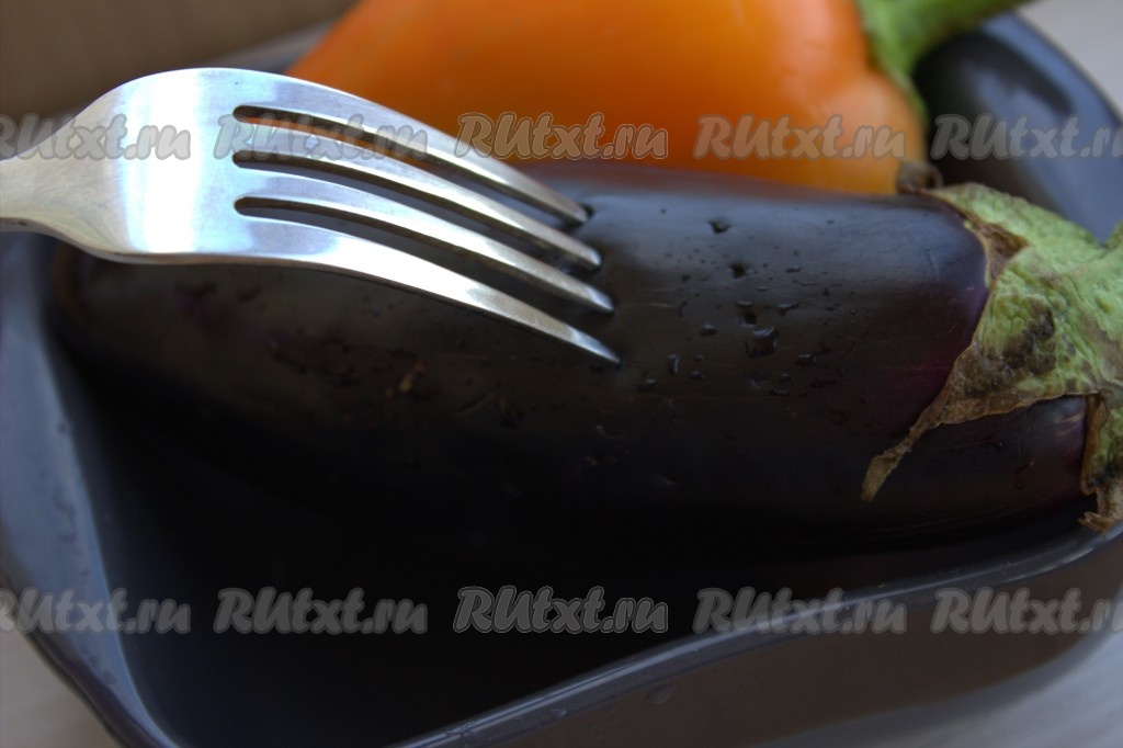 Болгарский перец вымыть. Баклажан вымыть, а затем наколоть его вилкой в разных местах. Болгарский перец и баклажан поместить в жаропрочную форму (или на противень) и отправить запекаться в разогретую до 200 градусов духовку на 20-25 минут. Овощи должны стать достаточно мягкими (они должны легко прокалываться вилкой).