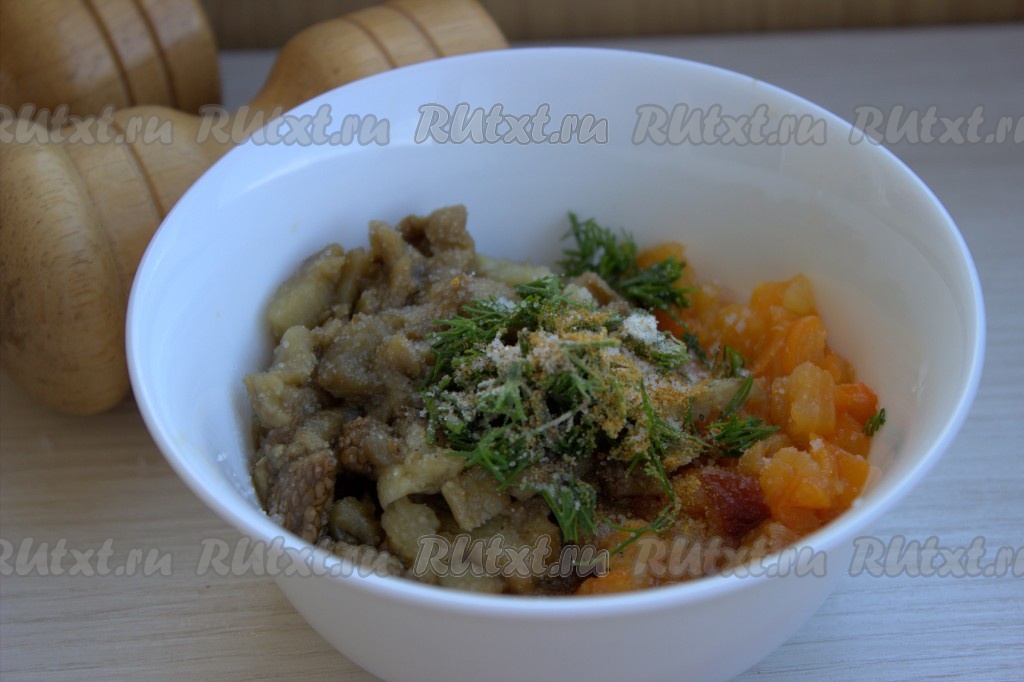 В миске соединить нарезанные баклажаны и болгарский перец, хорошо перемешать, посолить, приправить по вкусу специями, влить растительное масло, я ещё добавила мелко нарезанный укроп, перемешать и начинка для фарширования помидоров готова.