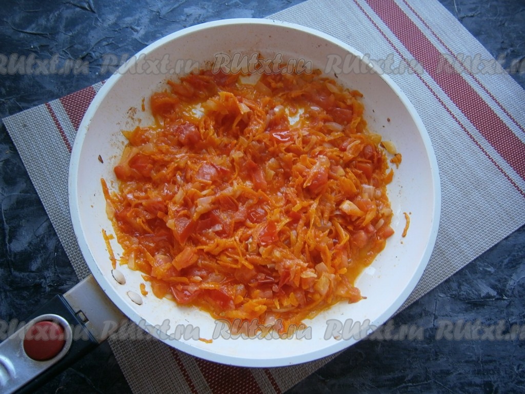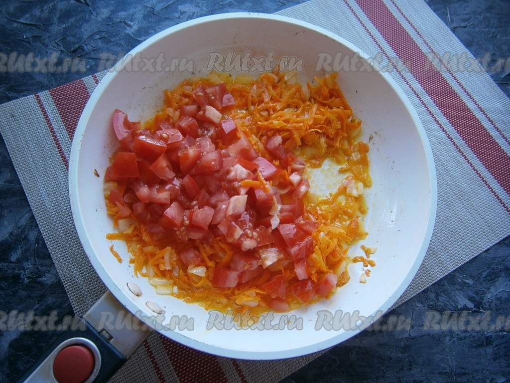 Обжарить овощи до мягкости на среднем огне, помешивая время от времени, затем добавить нарезанные мелко (или натёртые на тёрке) помидоры.