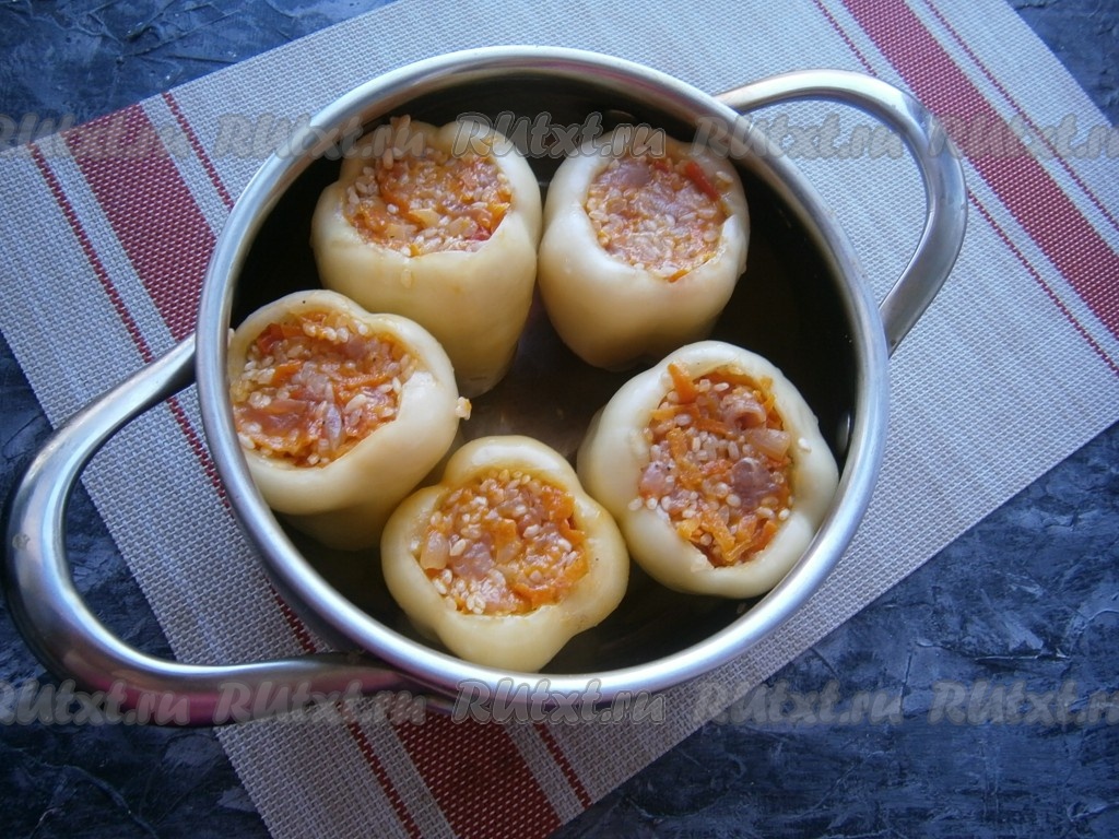 У болгарских перцев удалить хвостики и семена, наполнить их подготовленной начинкой. Поместить перцы вертикально в кастрюлю с толстым дном (или в казанок), влить кипяток на 1/3-1/2 высоты перцев и поставить на огонь.
