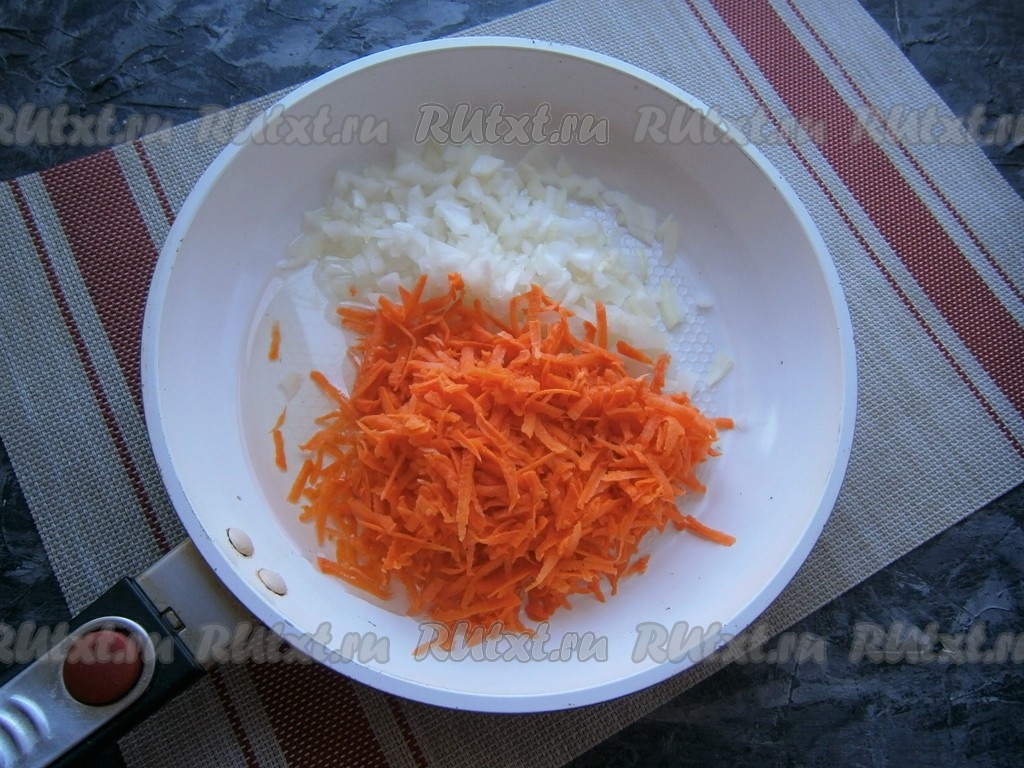 Почистить морковь и лук. Мелко нарезать лук, морковь натереть на крупной тёрке и поместить в сковороду с растительным маслом.
