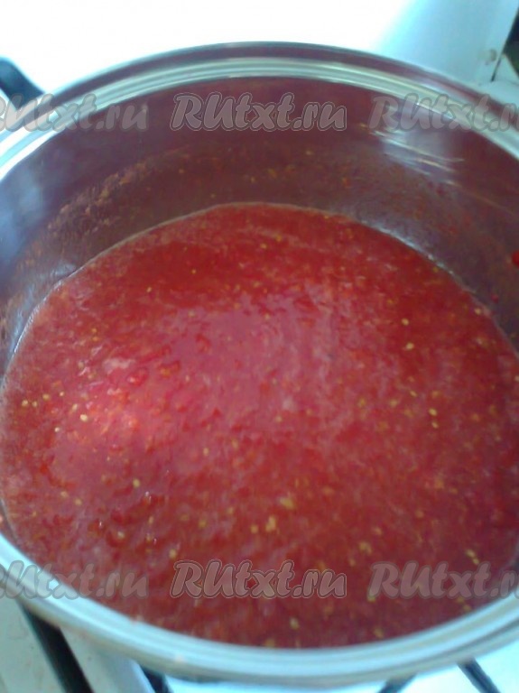 Помидоры с помощью блендера (или мясорубки) измельчаем до кашеобразного состояния и выкладываем в кастрюлю (посуду нужно брать из неокисляющегося материала), ставим на огонь.