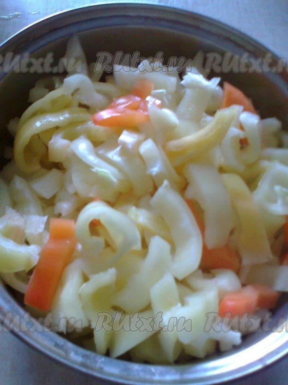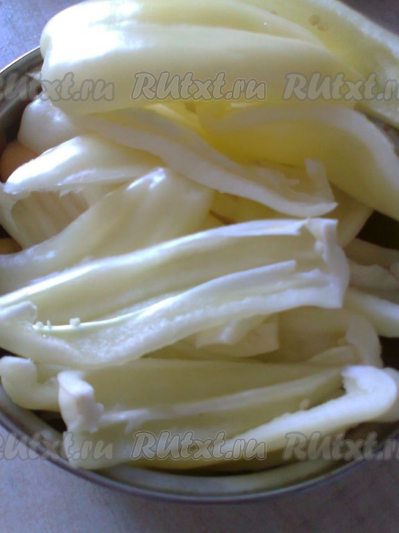 Очищенный болгарский перец нарезаем соломкой (или кубиками).