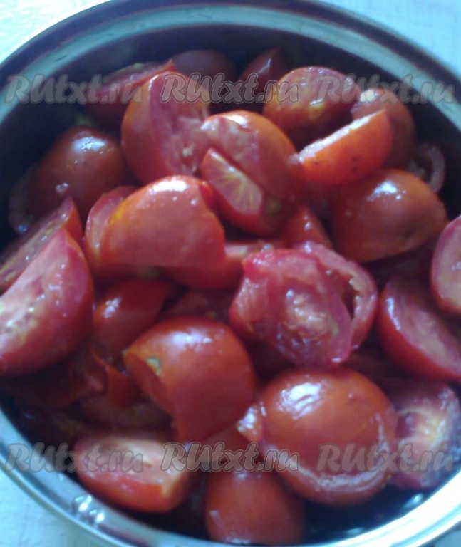 Красные, спелые помидоры тщательно моем, вырезаем плодоножку. Разрезаем каждый помидор, в зависимости от его размера, на четвертинки или половинки и кладём в глубокую миску.