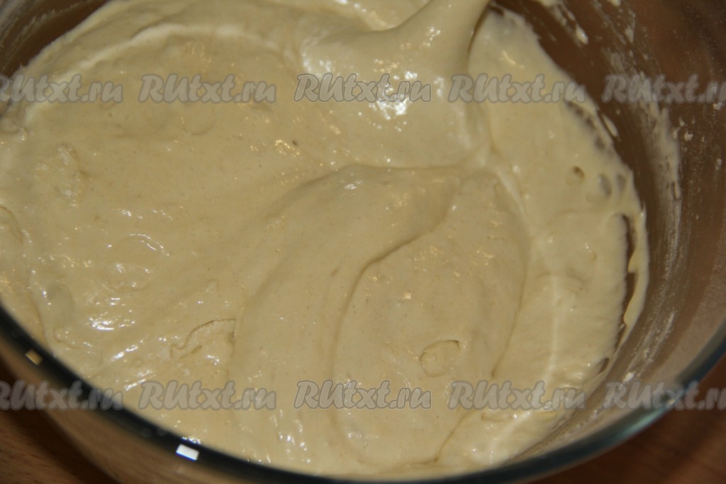 Аккуратно перемешать тесто лопаткой. Тесто для приготовления бисквитного пирога с ревенем получится очень воздушным, в меру густым (как на фото).