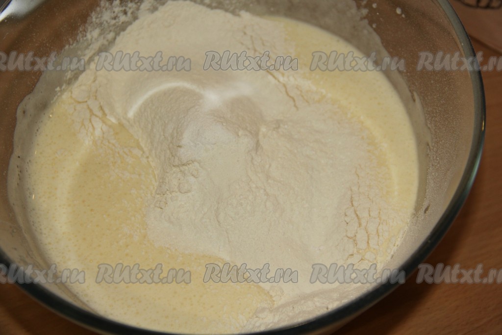 Всыпать в яичную массу просеянную муку и разрыхлитель.