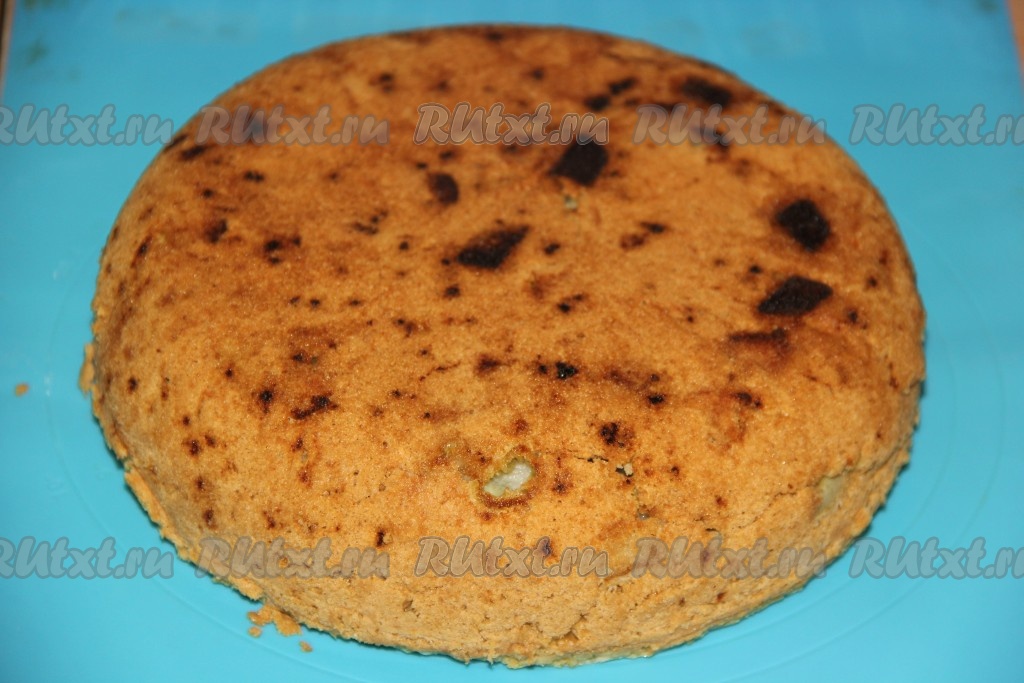 Поставить чашу с тестом в мультиварку и закрыть крышку. Выставить режим "Выпечка" на 80 минут. По истечении времени открыть крышку и проверить пирог сухой шпажкой (если пирог готов, шпажка после прокалывания пирога останется по-прежнему сухой). Готовый пирог перевернуть на решётку (или доску) и остудить.