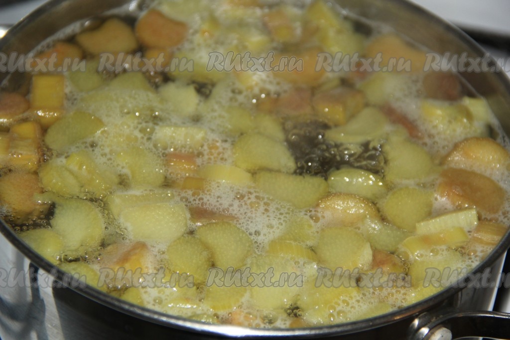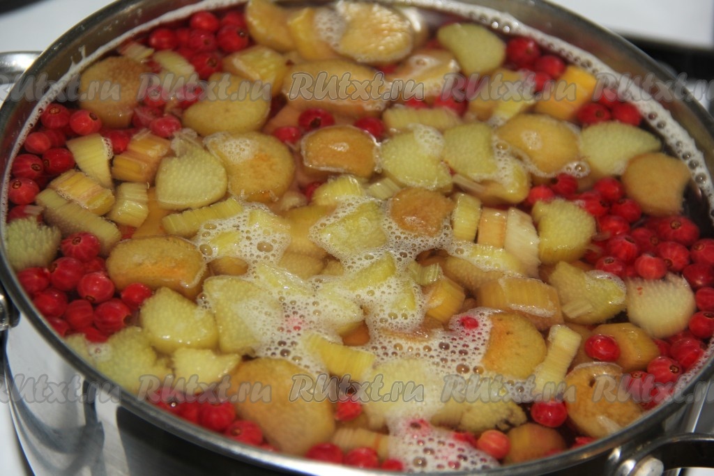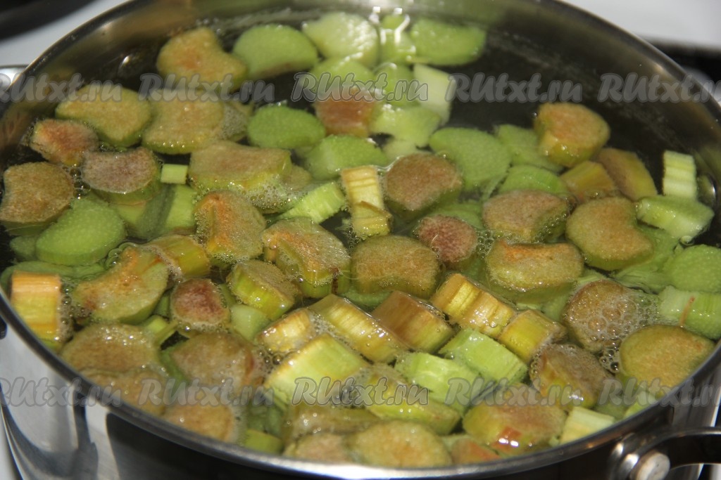 Варить компот с ревенем 3-4 минуты с момента закипания.
