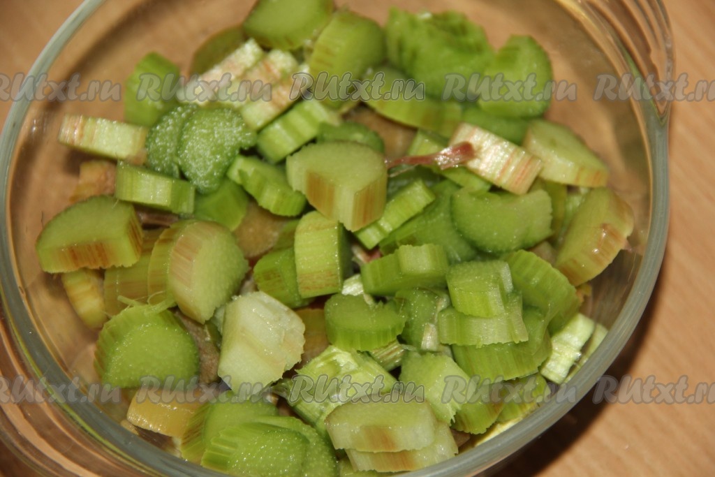 Стебли ревеня вымыть, а затем снять плёнку по всей длине каждого стебелька. Нарезать очищенный ревень на кусочки.