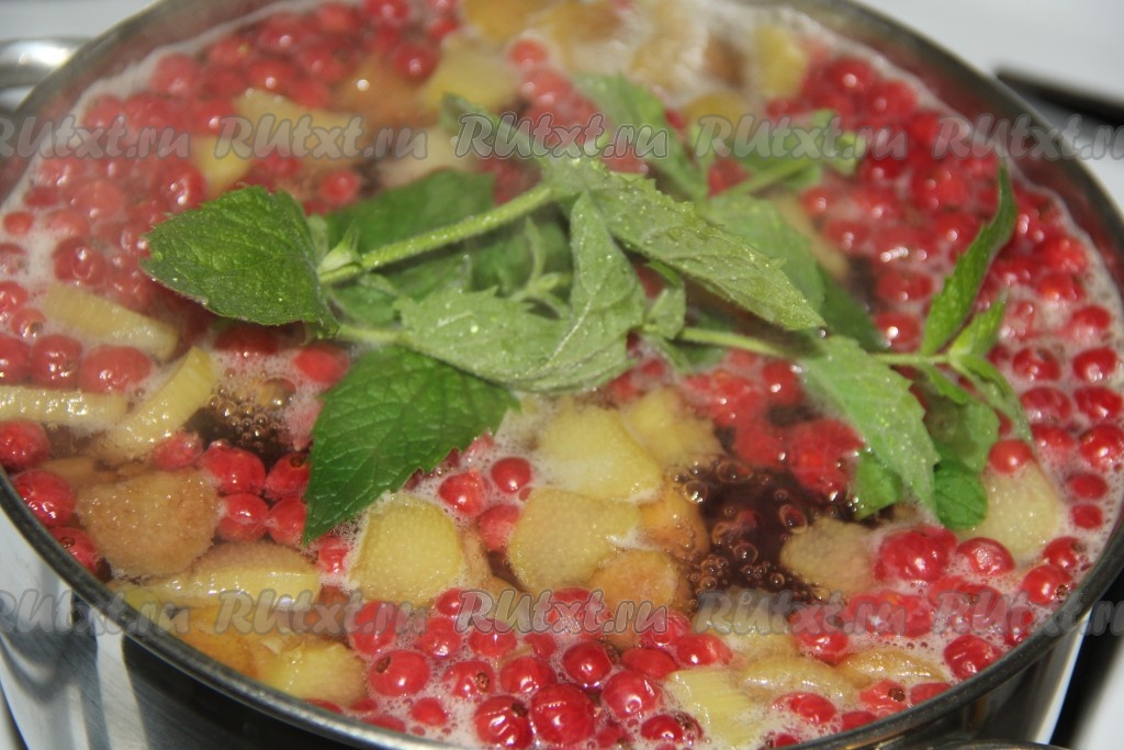 Затем, если добавляете мяту, промойте пару веточек и добавьте в кастрюлю с компотом, доведите до кипения и снимите с огня. Дать напитку из ревеня и красной смородины, накрыв кастрюлю крышкой, полностью остыть. При желании, компот можно поставить в холодильник и дать ему хорошо настояться.