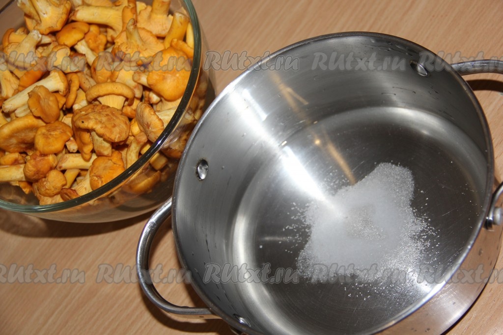 Лисички перебрать, удалить листочки и траву. Промыть грибы под проточной водой. Если грибочки крупные, то можно их разрезать на 2 части. У меня маленькие грибочки. В кастрюлю влить воду, всыпать соль и сахар.