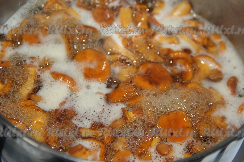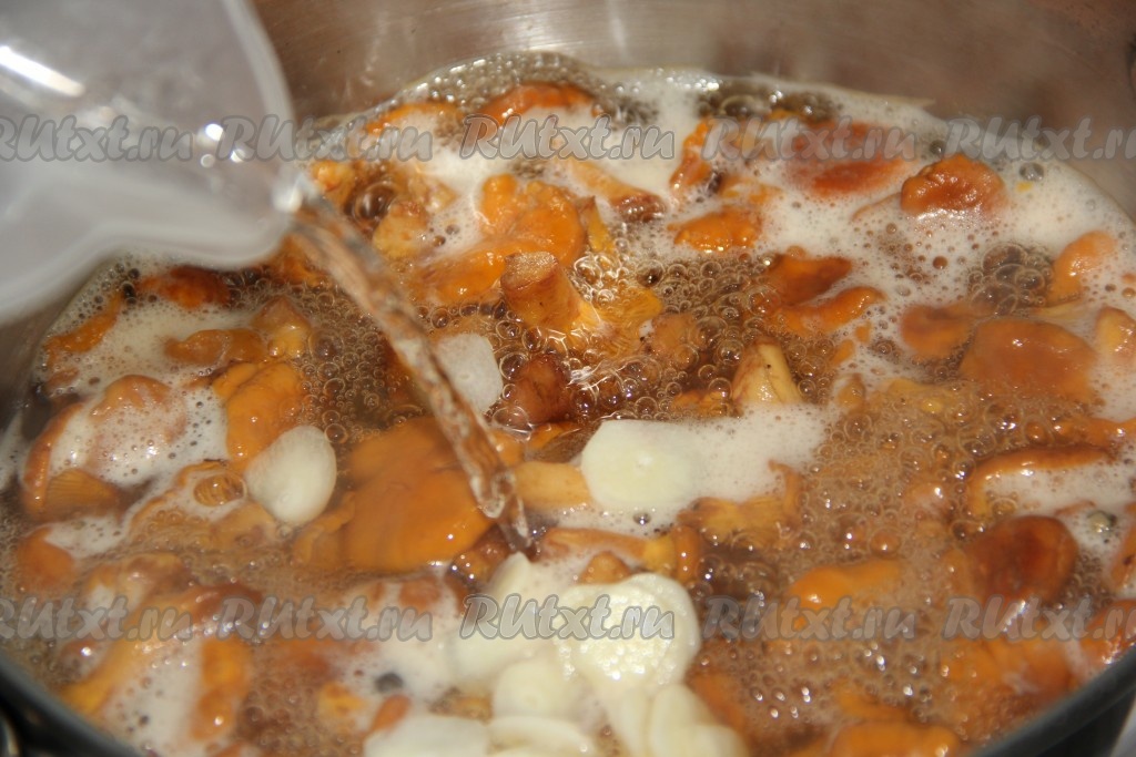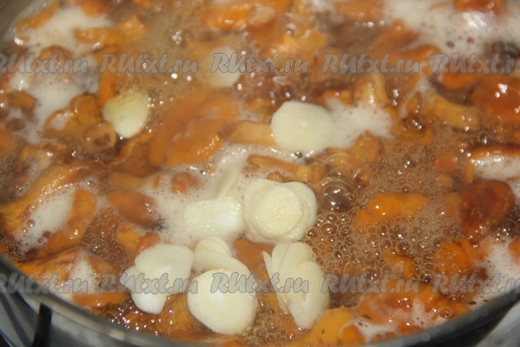 Когда лисички проварятся 15-20 минут, выложить к ним очищенный и нарезанный лепестками чеснок.