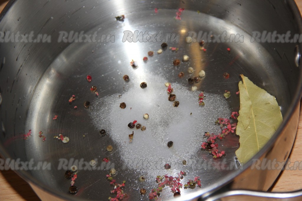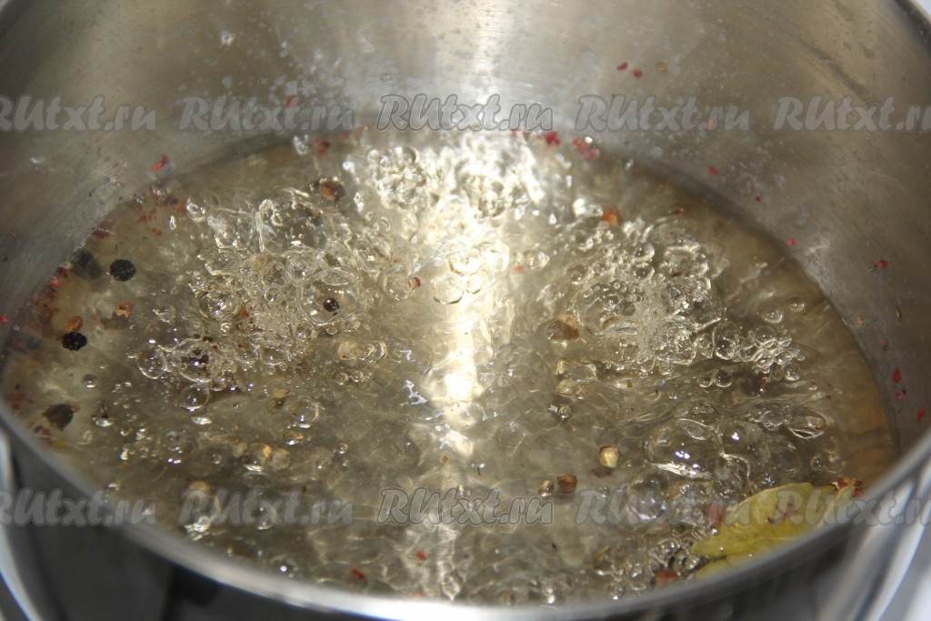 Поставить кастрюлю с водой со специями и сахаром на огонь и довести до кипения.