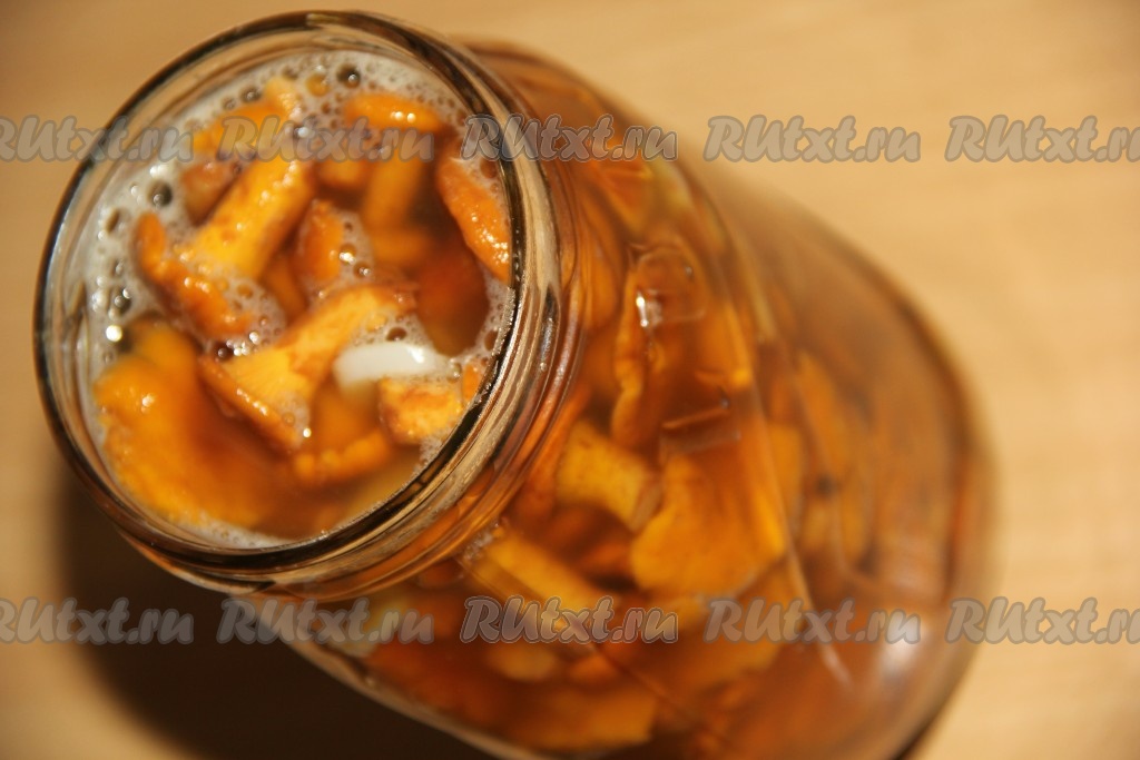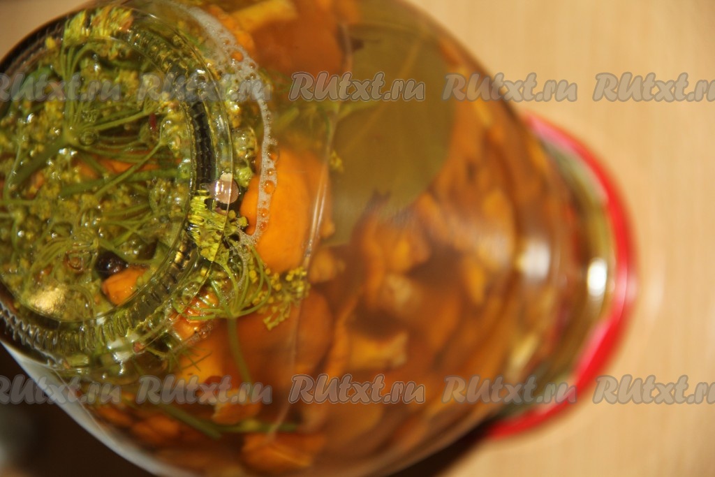 Выложить лисички и чеснок в банку и залить горячим маринадом, в котором варились грибы.