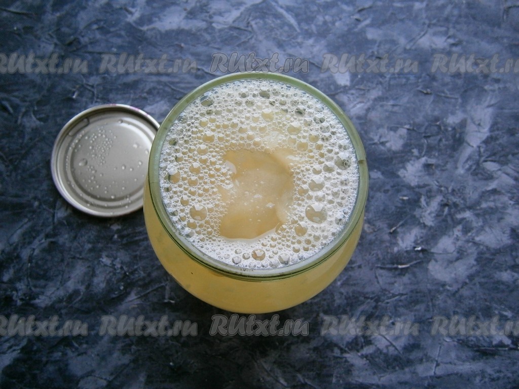 Перелить готовый, кипящий компот в простерилизованную банку вместе с фруктами.