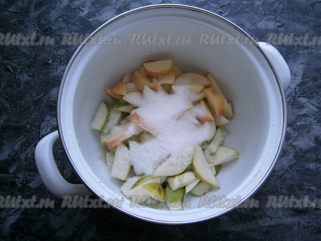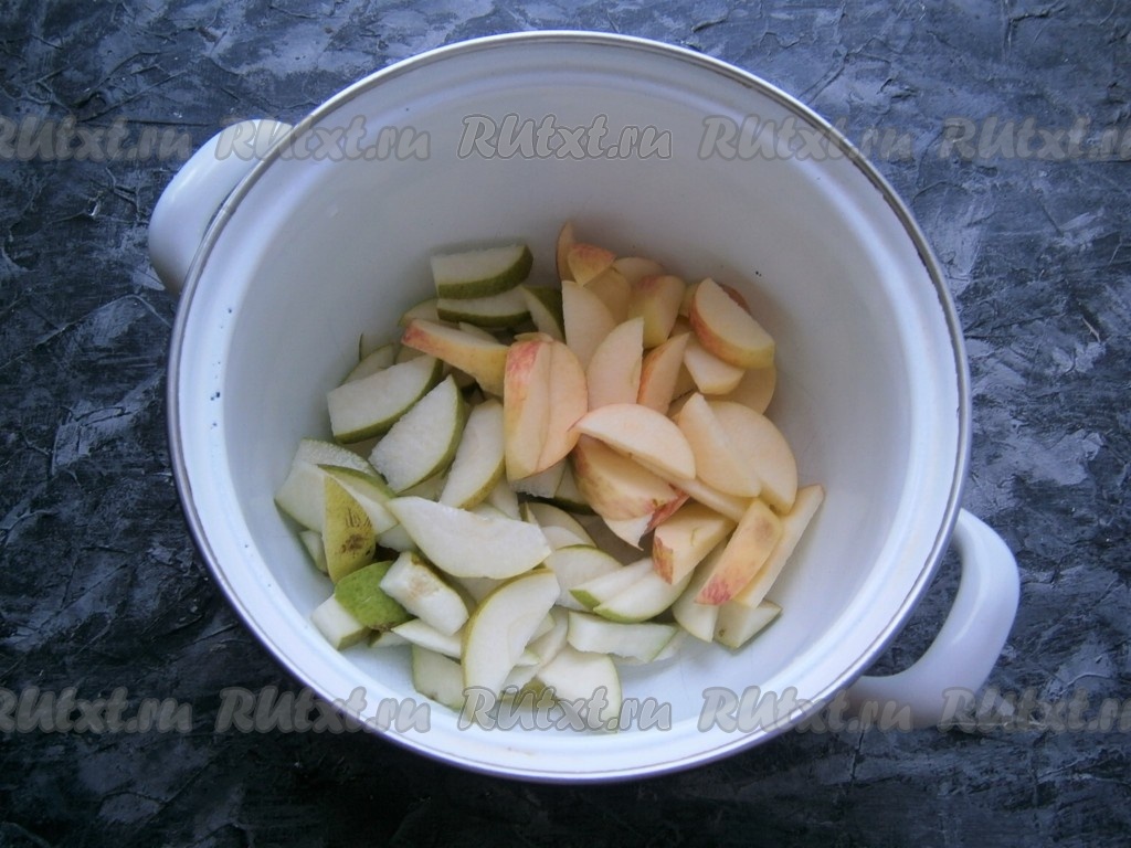 Вымыть груши и яблоки, удалить из них семена и хвостики, а затем нарезать в кастрюлю дольками.