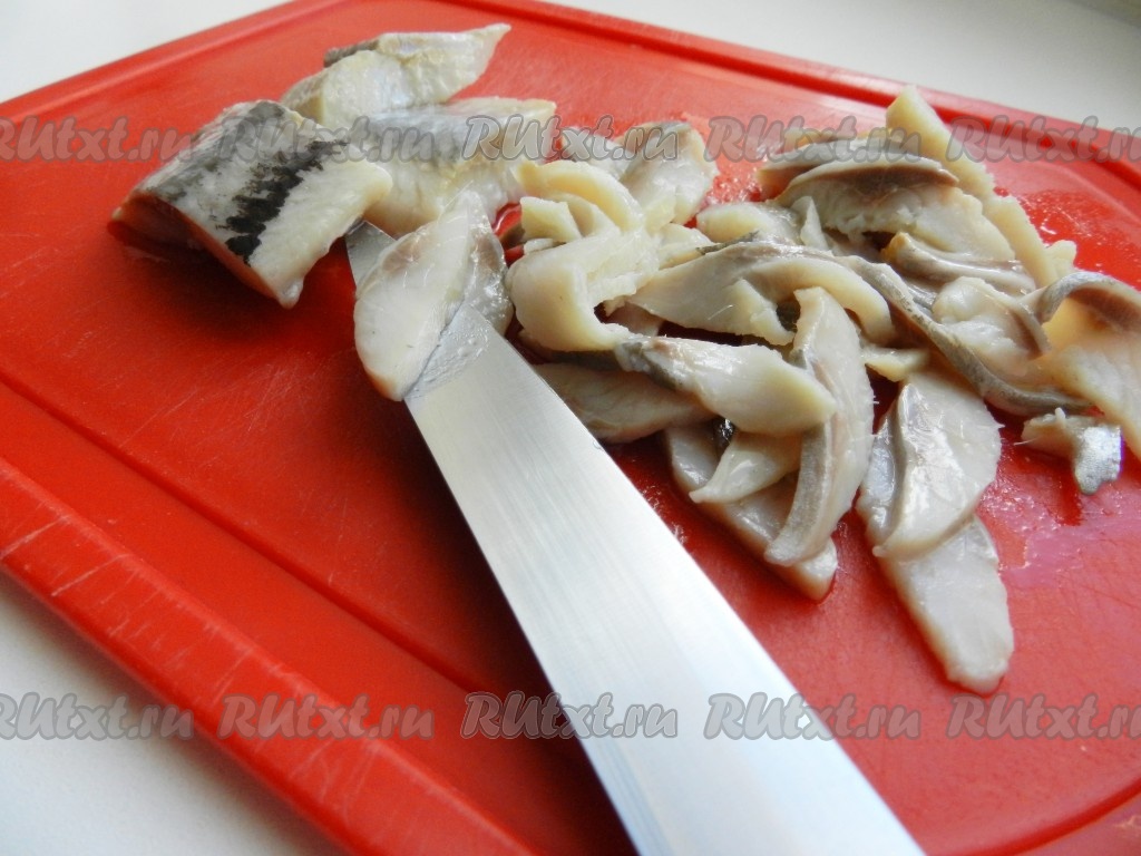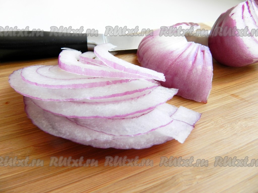 Нарезать лук тонкими полукольцами. (!) Лук для этого салата нужно брать не горький.