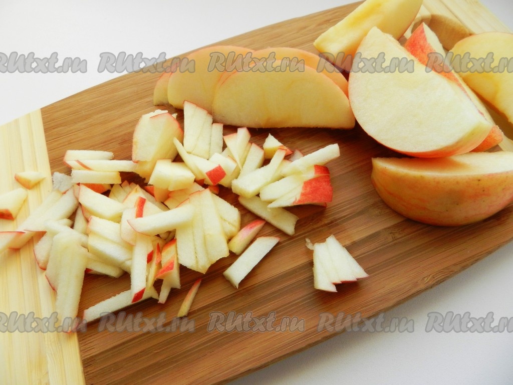 Яблоко сбрызнуть лимонным соком, чтобы оно не потемнело, сложить в салатник порезанные лук, селедку, яблоко.
